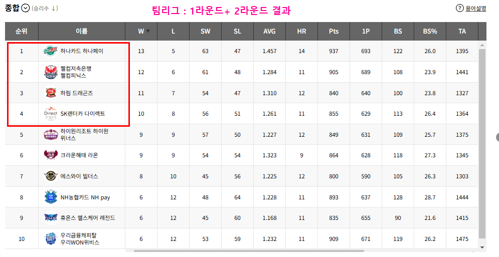 - 1~2라운드 가지 집계결과는 하나카드가 선두, 웰컴저축은행이 그 뒤를 잊고 있다.